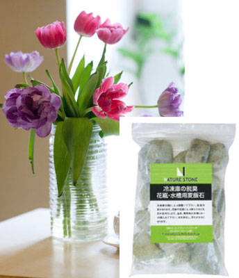 石の比表面積が大きく微細孔があるために、脱臭効果あり、冷蔵庫を無臭にします。ミネラル活性水の作用で生花が長持ちします。水槽の中の不純物汚れを浄化します。