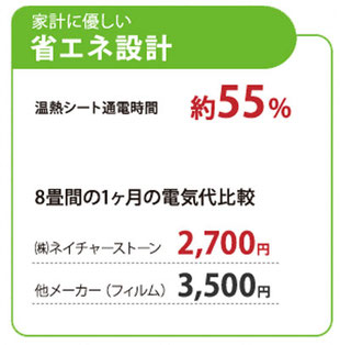 他社の温熱シートと比較して約55%と少ない設計です。8畳間の1ヵ月の電気代を比較してみると・・